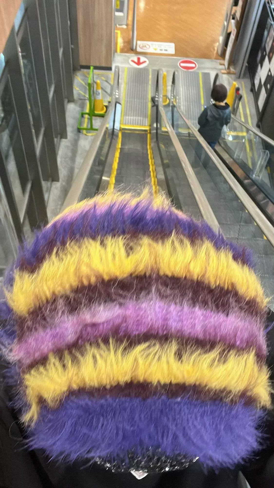 Soft, textured fur balaclava hood featuring bold striped detailing. designed with a plush, furry finish for a statement look. snug fit with an elongated neck for added warmth.